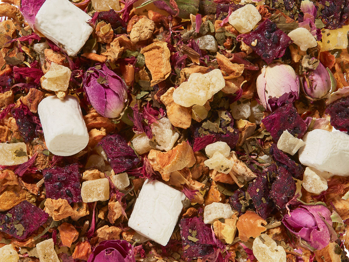 Apfelstücke, Ananaswürfel (Ananas, Zucker), lila Drachenfruchtwürfel (Drachenfrucht, Reismehl), Brombeerblätter süß, Marshmallows (Glukose-Fruktose-Sirup, Zucker, Wasser, Gelatine, Maisstärke, natürliches Aroma), Aroma, Rosenknospen, Kornblumen.