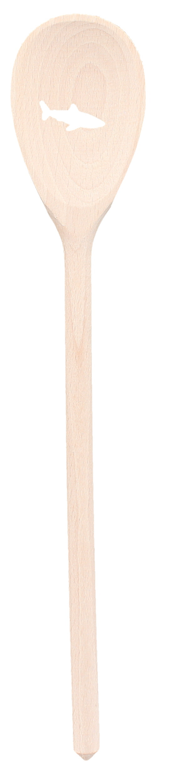 Der Kochlöffel ist 30 cm lang und mit einem Hai-Motiv graviert.